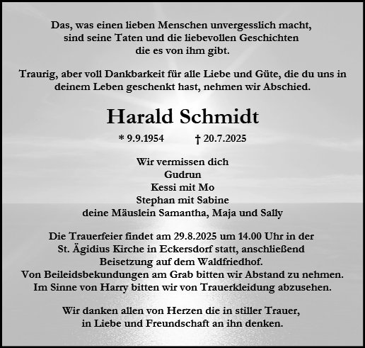 in diesen Tagen fühlen wir mit Ihnen und wünschen Ihnen von Herzen, dass Sie aus den glücklichen Erinnerungen Kraft schöpfen, um positiv in die Zukunft zu gehen. Diese Gedenkseite möge Ihnen dabei helfen, Ihre Trauer zu teilen und das Andenken gemeinsam wachzuhalten.
